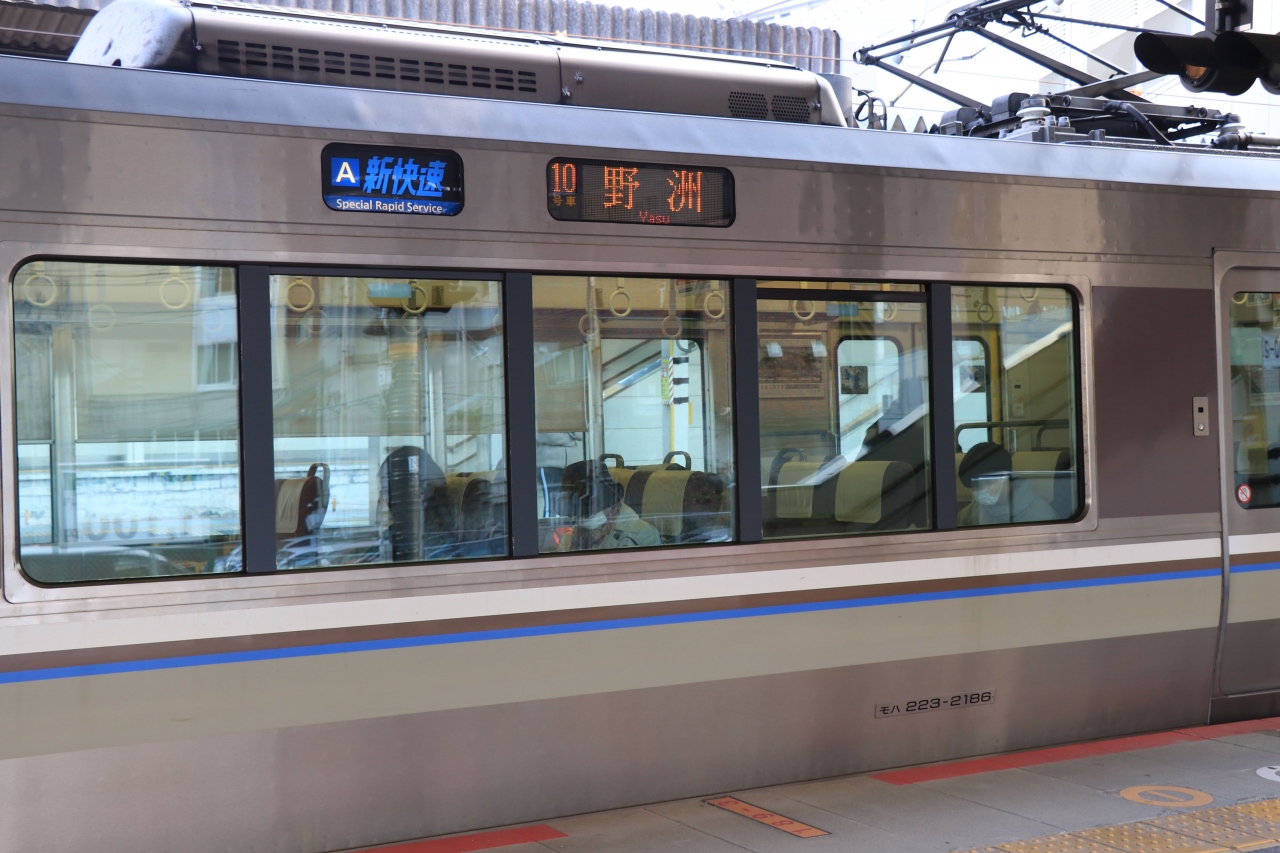 京阪神地区では通過駅も多くスピードが速いことに異論は出ないであろう列車でありますが、運転席の後ろから前を眺めているとその速さに改めて驚かされます。通過駅では目の前をビュンと通過されるだけで恐怖を感じますが、乗っていても「このスピードで大丈夫なのかい・・・」と思ってしまうほどです(笑)