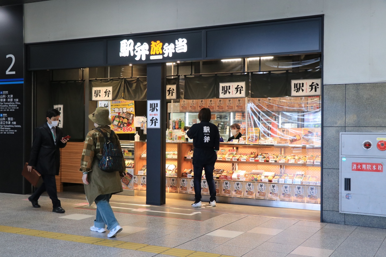 在来線の改札内にあり、特急列車や新幹線改札を入る前後などに使うことができます。美味しそうな弁当がいくつも並んでおり選ぶのに苦労してしまうほど。種類が多いのでリピートして使ってみるのも良いかもしれません。袋は有料で5円/枚とのこと。気になる方は持参するのもアリかと。