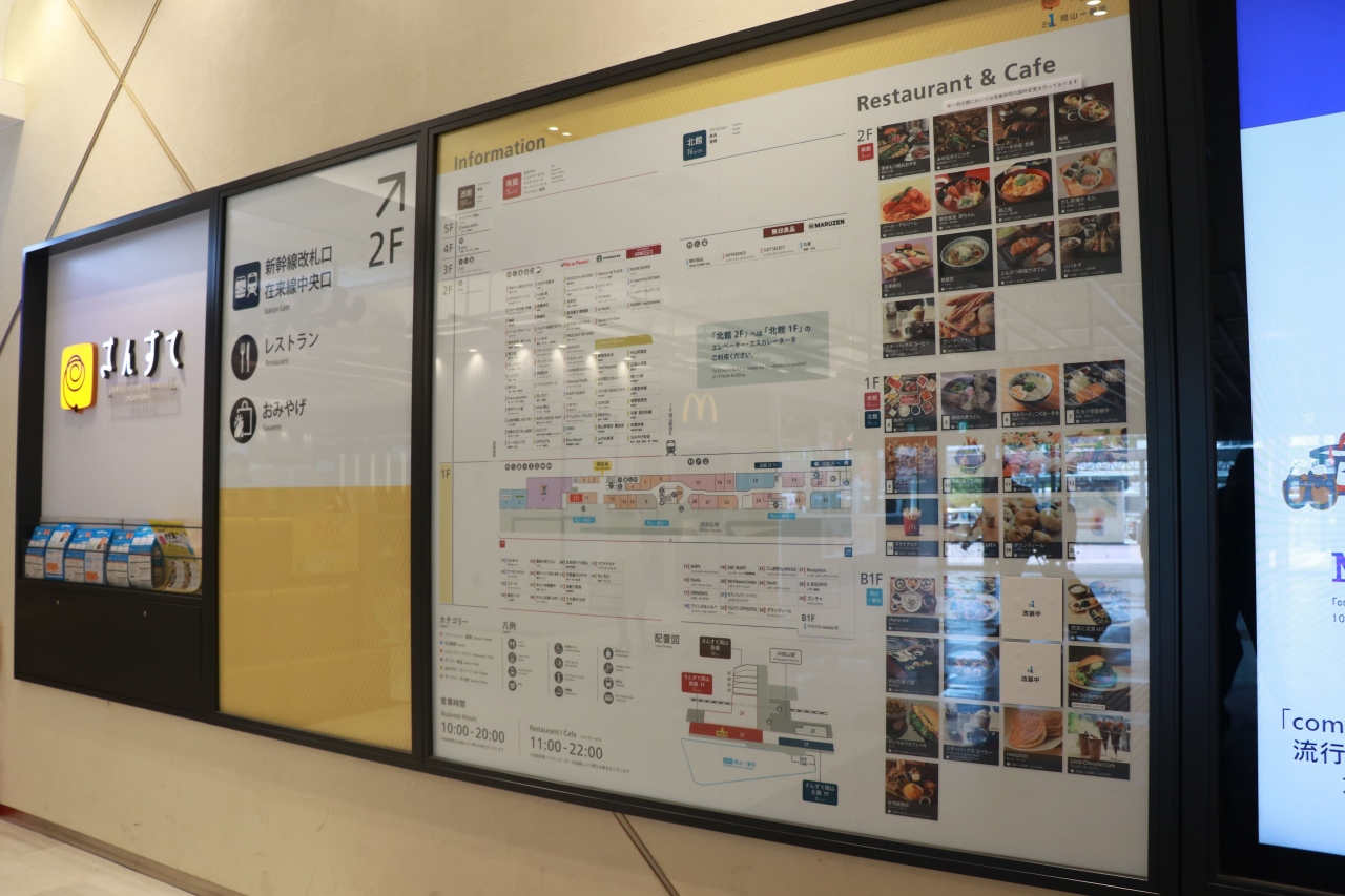 新幹線口側に広がる商業施設の一つで、改札階から1,B1Fとあり土産物店や総菜・飲食店などのテナントも入っており賑わいがありました。通路も広く案内所もあるほど敷地面積があるので、子供連れなどは迷子にならないように注意が必要かもしれません。