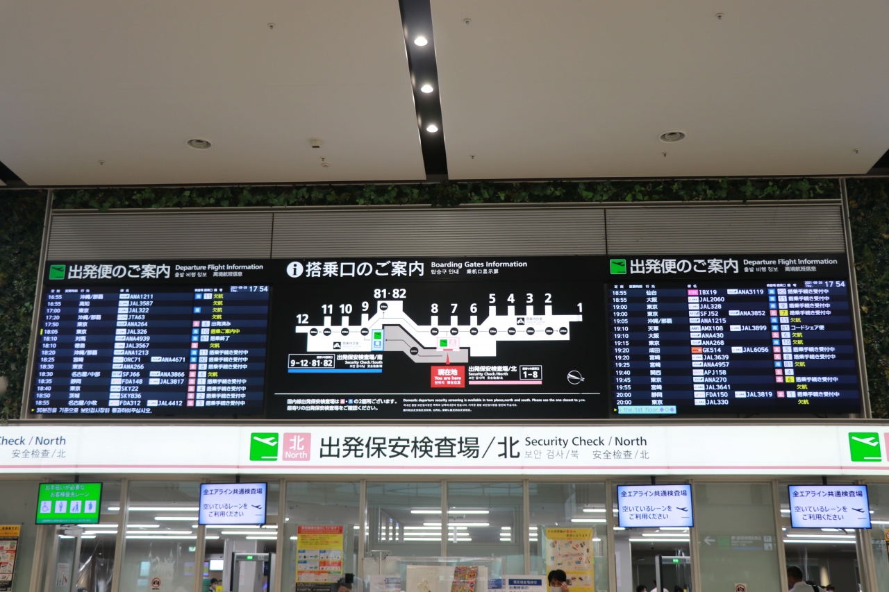 国内線・国際線とターミナルは分かれているものの、同一ターミナル内での区分けがなされていないのでJALやらANAやらその他各社がごちゃ混ぜになっており、同じANAでも便によって保安検査場が異なる場合もあるようです。(内側から相互に移動できるのでそこまで不便なわけではありませんが) 当日のゲート変更もあるので電光掲示板で最新の情報を確認しておくのが良いかもしれません。