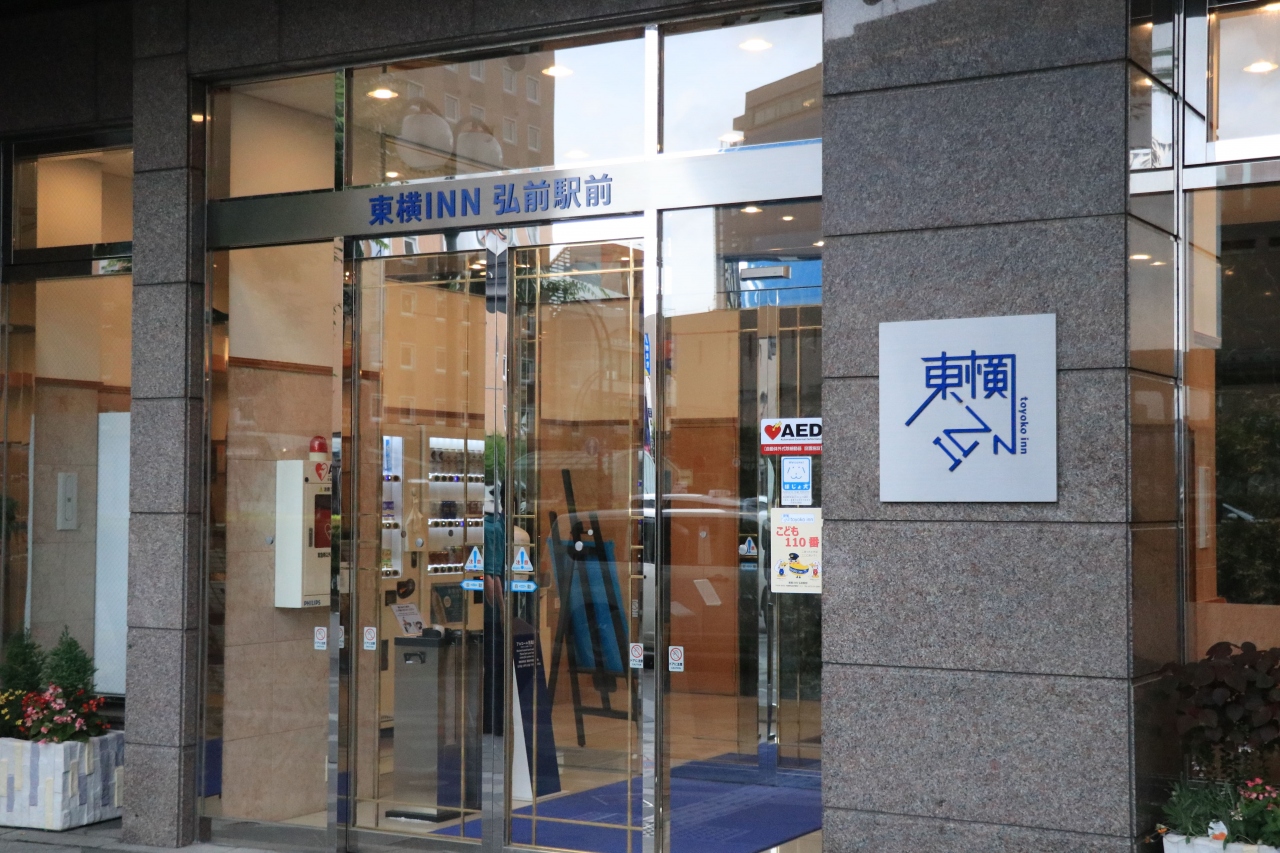 弘前駅の建物を出てものの15秒ほどでたどり着ける好立地にある東横イン。周辺には居酒屋をはじめとする飲食店が数多くあるほか、ホテルでは無料の朝食が出るので食事に困ることはまずないかと。画期的だなと思ったのは、部屋に入った後のテレビに朝食希望有無のアンケート画面があり(もちろん答えなくても利用することはできます)食品ロスの削減や経費圧縮といった経営努力が垣間見える瞬間も。チェーン展開していることもあり室内の作りやフロンでのサービスは他と変わらず統一されていて安心して利用することができました。朝食に出てくる青森県産のりんごジュースは最高です!