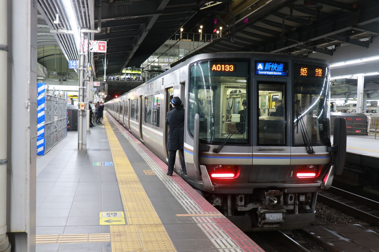 京阪神エリアのみならず米原や姫路までも12両編成の列車が昼夜問わずバンバン走っています。座席が二人掛けで進行方向を向いているタイプのものなので、昼間は良いのですがラッシュの時間帯だと窓側の客は出入りするのに手間がかかるのが悩みどころかと。特急列車のように長時間走りっぱなしという区間はないものの、車両にはお手洗いが付いているので近距離利用でも安心して使えるのは良い点かなと思います。