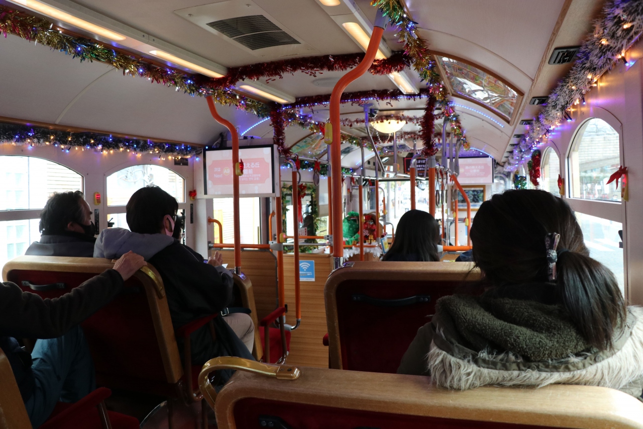 連接で通常よりも長~いバス。運転士は慣れた様子でどんどん進めていきますが、後部に乗っているとなんだか変な感覚がします。速度もゆっくりで所要時間も多めにとってあるので通常の路線よりも時間はかかりますが、マイクでの観光案内に耳を傾けつつ外の景色を眺める楽しいひと時を過ごすことができました。横浜駅東口BTと山下ふ頭との往復ですが、周遊コースになっており往復で走行経路が異なるので路線図は事前に確認しておくのが良いかと。