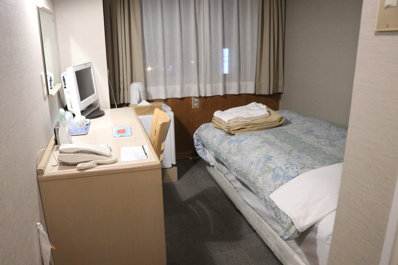 安さで飛びついた訳ありプランのお部屋。フロア端に位置し6畳ないくらいのスペースにベッドをはじめシャワー等水回りのもの、サイドテーブルやテレビなどが所狭しと並んでいます。寝るだけなら問題はありませんが、気のせいか館内のWi-Fiも届きにくい状態でした。ホテルに駐車場はありますが数が多くなく、満車の場合は提携しているタイムズへ誘導されます。それでも400円/泊とかなりリーズナブルでありがたいところです!