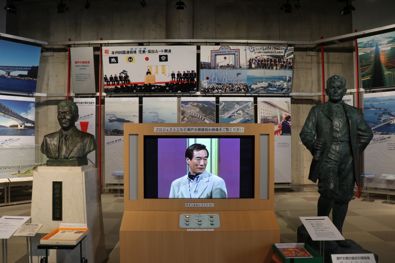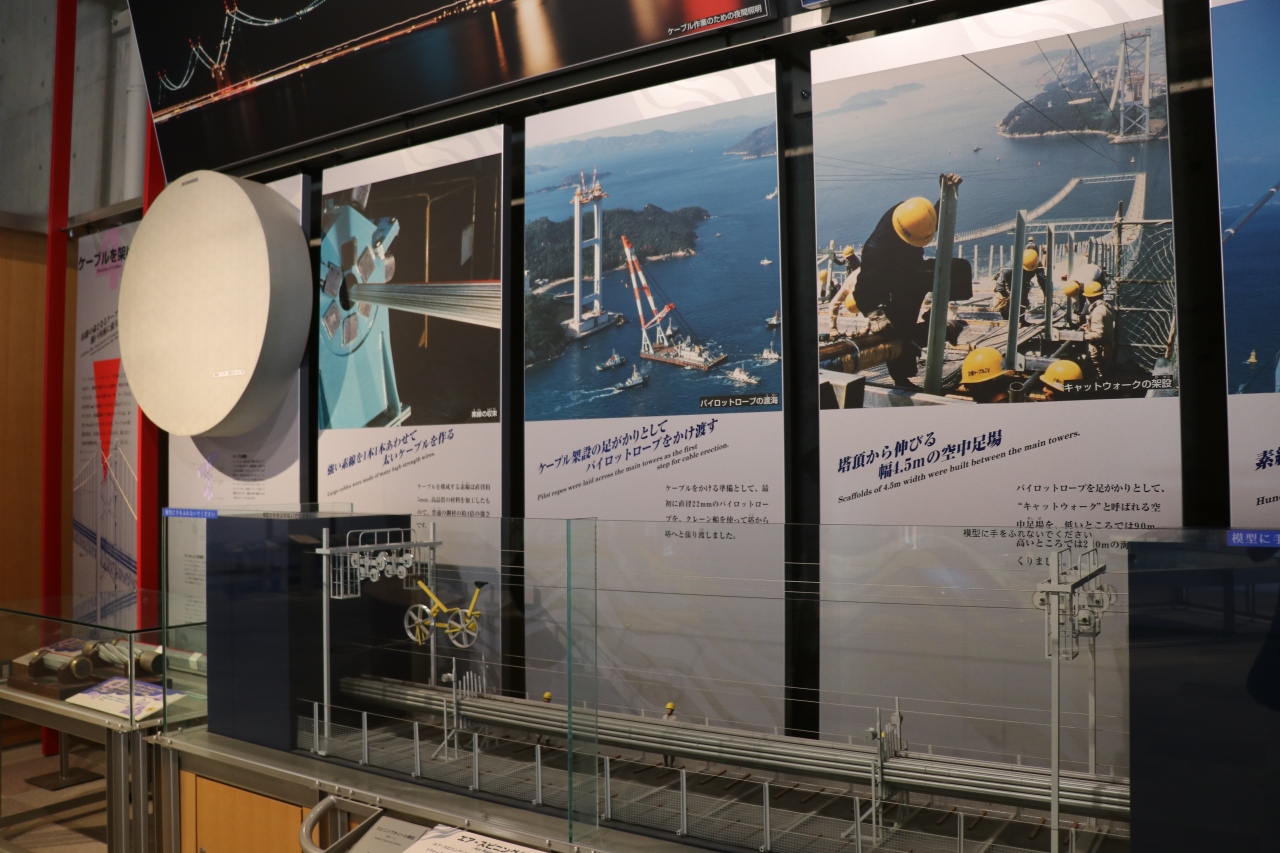 入館を躊躇われないようにしてもらうためか、入り口付近に「入館無料」とデカデカと掲示してあったので喜んで入館。中には橋建設のきっかけや工法など現在に至るまでの流れが丁寧に展示されていて、ふらっと入った割にはかなり見入ってしまいました。過去のプロジェクトXなどの映像展示もあり、そうしたものを見ていると一時間では足りないほど。屋上からは瀬戸大橋を間近に眺めることができますが、下の展示を見た後だと同じものを見ていても見方が来ること間違いありません。