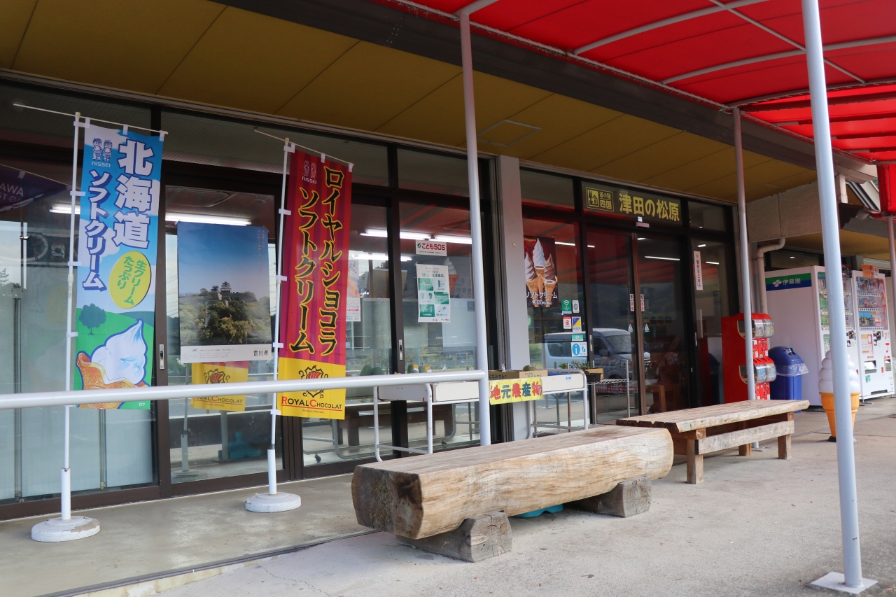 建物自体はこじんまりとしていて大きいわけではありませんが、駐車場から売店まで散策路になっており建物も蔵造になっていて、周辺の景色も含めて昔にタイムスリップしたかのようです。売店ではアイスが売られていたのですが、各種定番の味に加え「みまから」や「はったいこ」といった聞きなれない味のものも。建物外の風鈴が涼を感じさせてくれます。