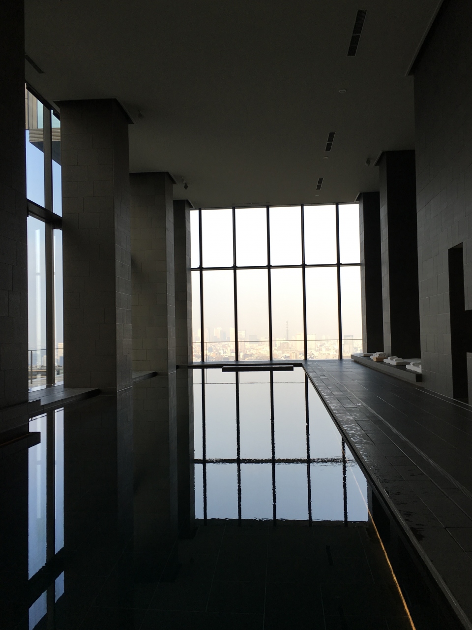 東京という大都会にありながら、ホテルの中に一歩入るとロビー、お部屋、大浴場、プールとビルの中とは思えない大きな空間があり、そして廊下やお風呂のロッカーなど一見無駄とも思えるところにもスペースが割かれています。