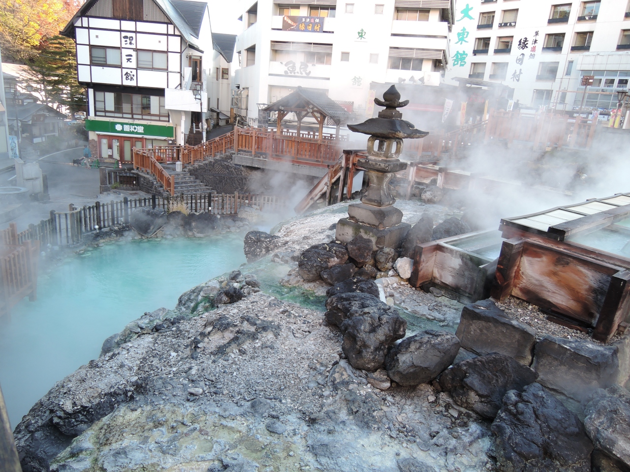 草津温泉で最大の名所である「湯畑」に直接面します。