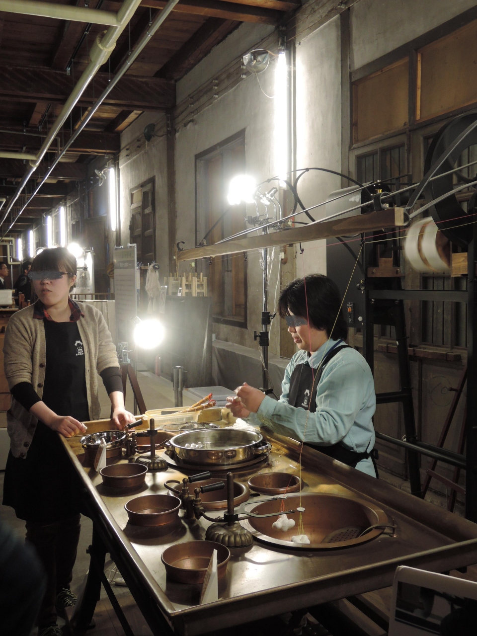 かねてから行きたかった場所ですが、機会が無くて、2015年11月が初訪問です。この時は、本の105ページに出ている図の共撚式での製糸を実演しており、実際に見て仕組みを確認できたことは良い経験でした。