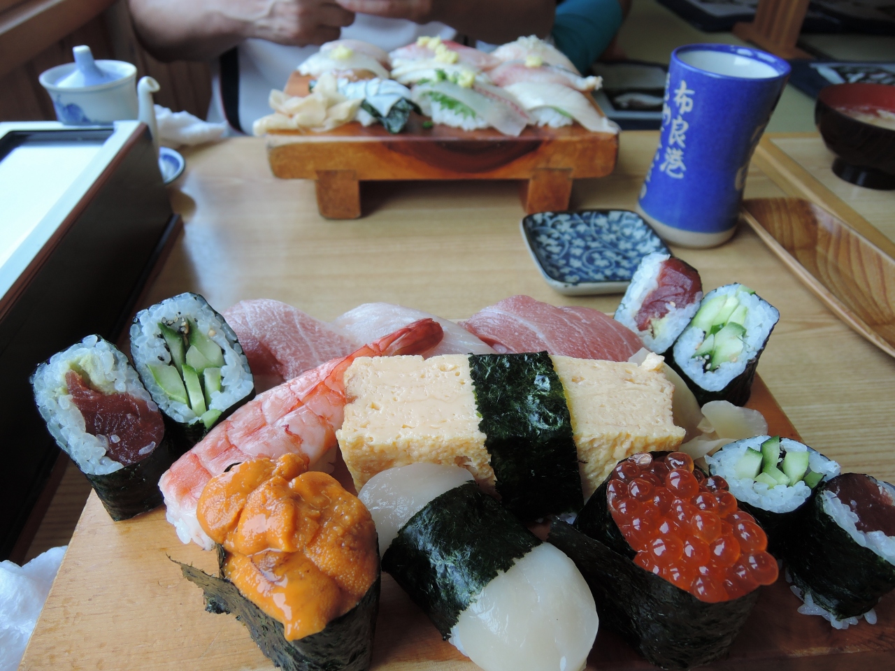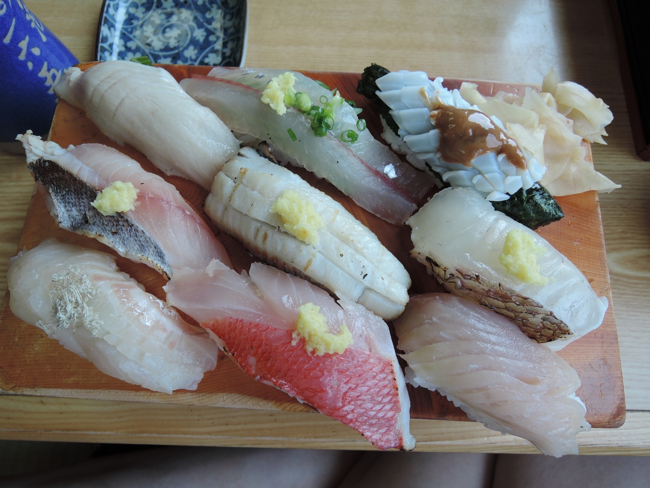 私が頼んだ地魚寿司(3,240円)は、ふわっと握った酢飯の上に大振りのサワラ、トビ、キモ載せのスルメ、あぶりのタチウオ・マダイ・キンメ、シメサバ等9貫、かみさんの特上(2,700円)はマグロ、ウニ、卵などごく普通のネタだがこれも美味しそう。でも気になったのは、ランチの寿司5貫+サンガの950円と、づけにぎり1,850円の方。次回はこちらを食べてみようと思っている。- 旅行時期