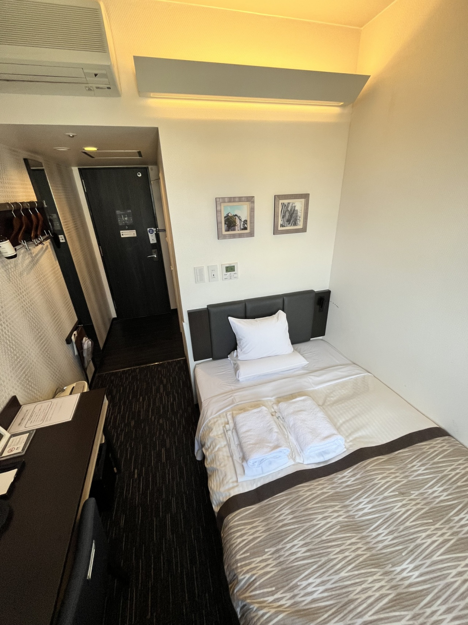2025年6月、ずらし旅の最安値ホテルにて宿泊、万博期間で、土日月の2泊38,500円東京新大阪往復新幹線付 シングルは格安。Google口コミ見ると汚いなどあったが、問題なかった。なぜかタオル、パジャマ二セット用意されていた。2泊分かと思いきや翌日も二セット。部屋はアパ並みに狭い。ユニットバスも激セマ。ま、寝るだけですのでよし。なか卯が目の前にあり朝食はそこで。ミネラルウォーターなし。冷蔵庫冷えない。スタッフ対応問題なかった。