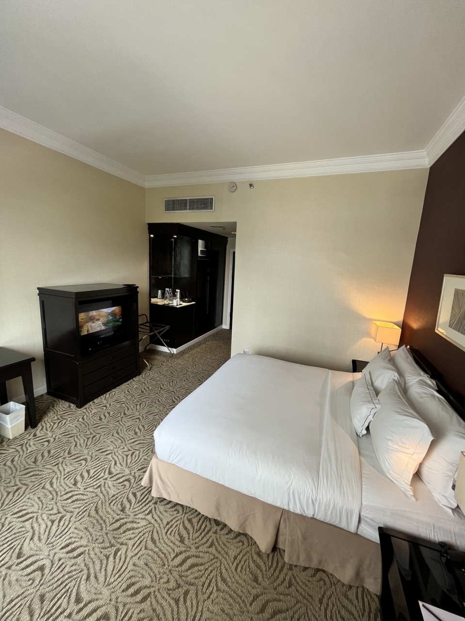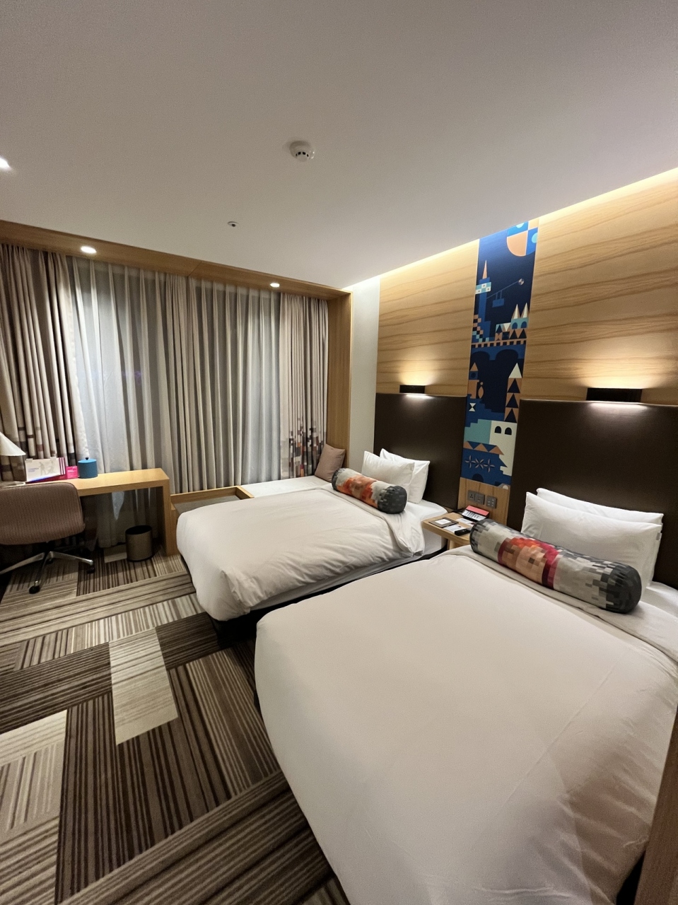 モノレール終点駅からすぐ。中心地から離れています。無料バス停留所の目の前、バス移動メインの人は◎。2023年2月高層階改修中につき、高層階とアップグレードのリクエストは却下。渡されたカードの不具合でエレベーター押せず。低層の5階にアサイン。部屋の入口ドアの建て付け悪く、バスルームの扉もボロボロ。枕が臭くテレビは小さく、ベッド周りにコンセントなし。ラウンジ特典は極小生ハムのみ。アルコールは有料。プール、ジム狭く、朝食は途中なのに全部下げられる。ヨーグルトもなく、料理の品数も少なく、味も残念。1泊6,600円でしたが、近隣のフェアフィールドのほうが良かったのかも。
