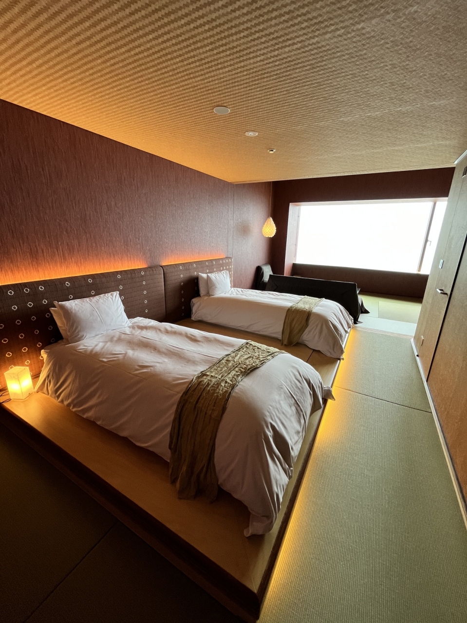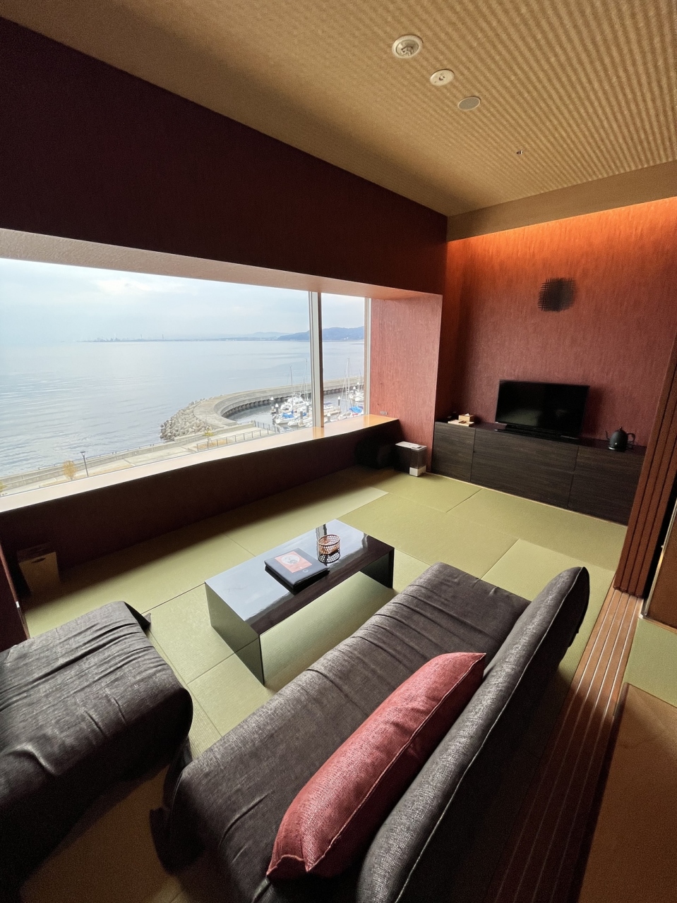 初めての星野リゾートで期待値高めで行きました。スタッフのみなさんは笑顔の対応で素晴らしかったです。しかしハード面はちょっと。部屋は、ベッドが小さくて、柔らかすぎ。またベッドの位置が一面畳なのに一段上がって板床になっており踏むとかなりの音がしました。また冷蔵庫の飲み物の種類が少なかった。窓は大きく眺望は良いものの、散歩している人と目が合いました。高層階をリクエストしたものの5階でした。食事処は階段を降りないと行けません。暗くて長い階段でした。お風呂は広かったですがせっかくの海沿いなのに海は見えず残念でした。サウナもなかったです。ウェルカムドリンクにスパークリングワインがあったのにグラスがなく、紙コップだけでした。朝夕とも食事はおいしかったです。