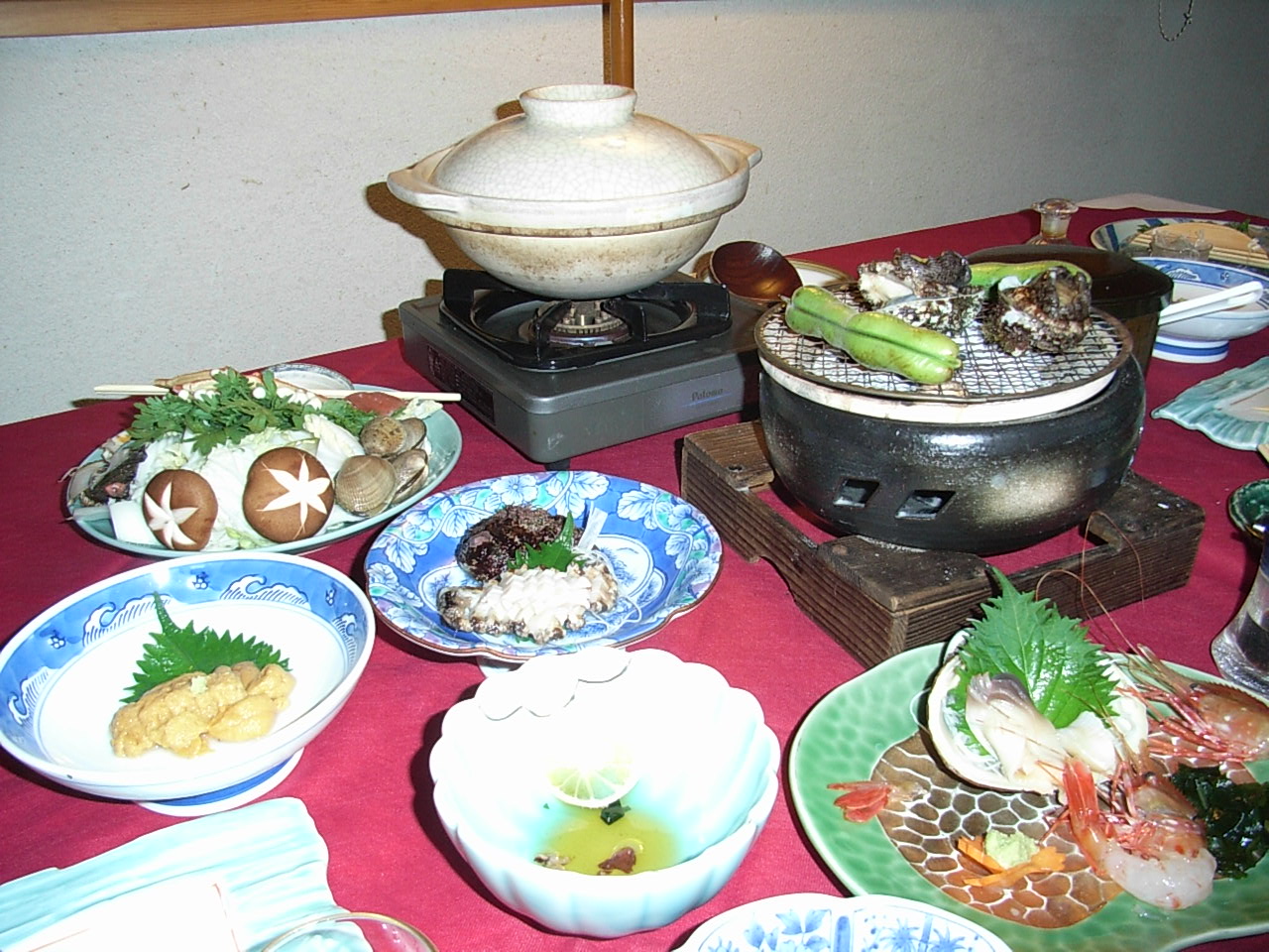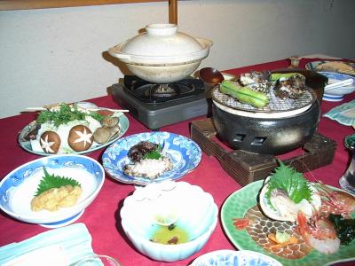 下のクラスのお料理をお願いしたのですが、天然あわびの踊り焼き・おさしみ、ぼたんえびのおさしみ、ひらめのお造り、季節がら生ウニ(量がたっぷり!)、なまこの酢の物、焼き魚、そして椀物の替わりという海鮮みそ汁。中身はあわび、さけ、ウマズラはぎ等の海鮮がたっぷり。美味しかった!!家では出せない味でした。これで少し生野菜があると尚良かったと思います。