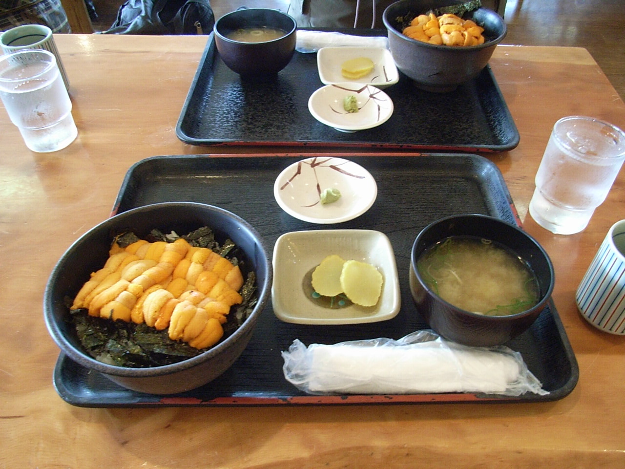 今回のお目当てはやっぱり生ウニ。毎日時価で、塩水ウニが1パックまるごと乗っかったウニ丼が最高です!今回は赤(バフンウニ)\2400、白(ムラサキウニ)\1400でした。