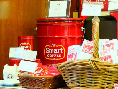 革張りソファ、壁、床も茶色い1932年創業のスマートコーヒーがあります。