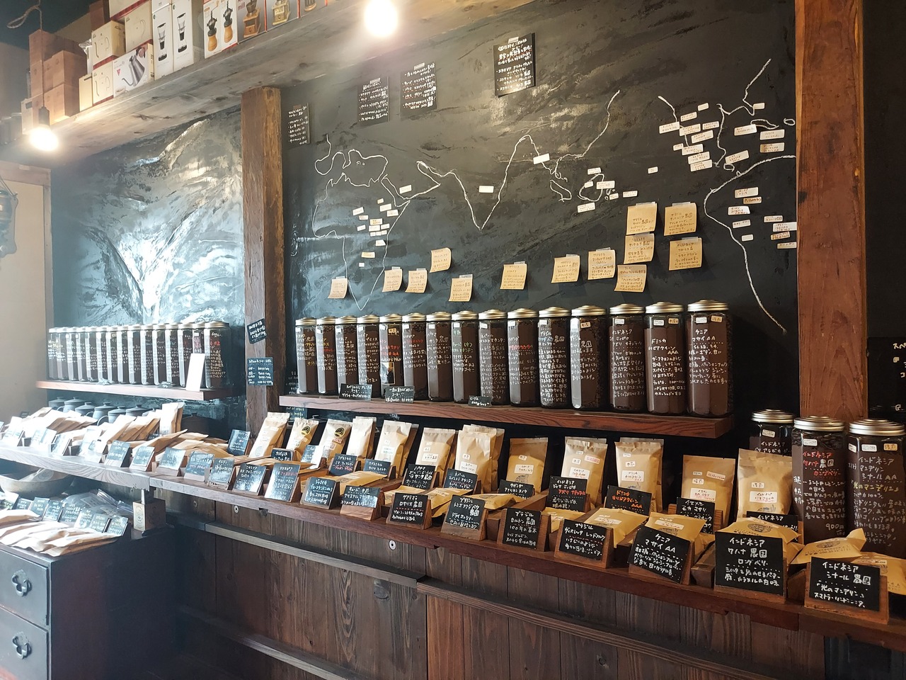 こじんまりとした店内の壁はコーヒ豆の産地及び特徴が描かれ、多くの種類のコーヒ豆が並んでいます・・また、4~5人が掛けられる椅子があり、好みの豆を選んでコーヒーを飲む事も出来ます・・価格350円也・・コーヒーと一緒にサービスのお茶も提供されます・・