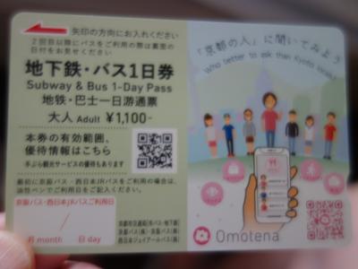 バス一日券がなくなり,地下鉄・ばす一日券1100円になった。5回のらないと元が取れない!こんな高い一日券は日本中でここしかないだろう。なんと京都人の頭の高いこと。少し昔のバス運転手の横柄さを思い出す。