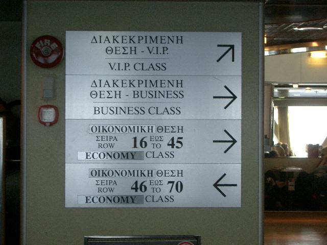 Hellenic Seaways の高速双胴船catamaranは、VIP, Business, Economy の3クラス構成でした。他社の船でも、このクラスなら3クラス構成になっているのではないでしょうか。