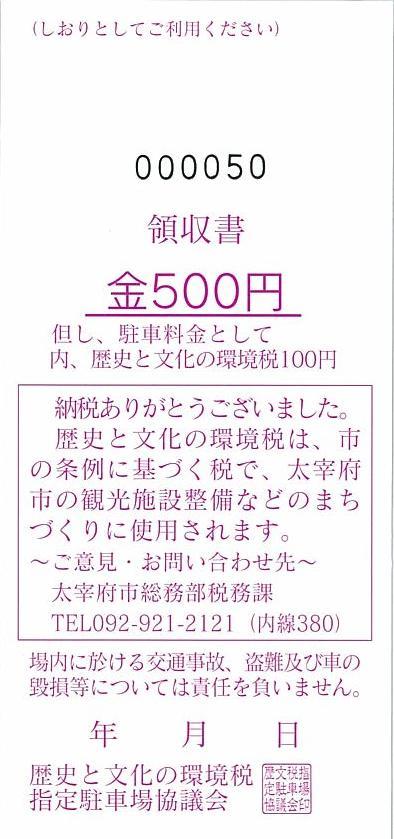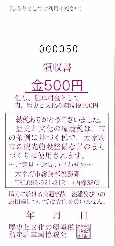 大宰府天満宮前の駐車場。500円ですが、「内、歴史と文化の環境税 100円」が含まれています。「納税ありがとうございます」と大宰府市総務部総務課に感謝されてしまいました。