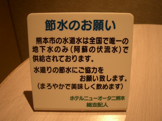 市内のホテルに泊まったら、こんな看板がかかっていました。考えてみれば、山から流れてくる水は、地表を流れても(川)、地中を流れても(伏流水)、本質的には変わりはありませんね。むしろ、後者のほうが、清浄度が保たれて、いいかもしれません。