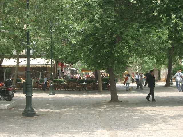 パンドロス通りのみやげ物店巡りからメテロポレオス広場に出るとちょうどいいところにお茶所があります。これがカフェ・メトロポールです。自然と足が向いてしまします。広場の向こうはミトロポレオス大聖堂。テラス席で冷たいものをいただくと、人間も息を吹き返します。