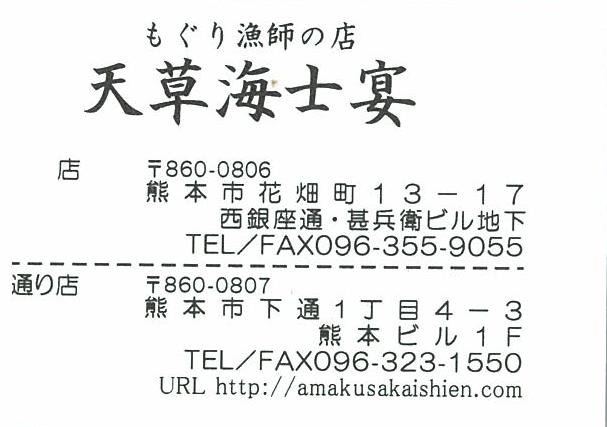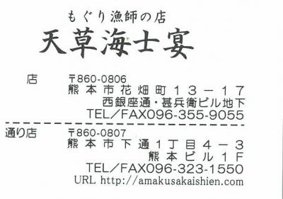 新市街、西銀座通りの「天草海士宴」。もぐり漁師の店を自称することだけあって、それはそれはうまい魚を食わします。魚介類の種類も豊富です。うまい魚をつつきながら、焼酎を飲んでいると、こんな天国が熊本にはあるのだ、と本当にうらやましくなります。
