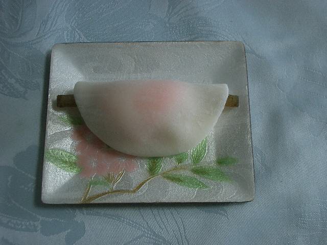 「葩(はなびら)」というおしゃれな名前の和菓子。「丸い羽二重餅に紅色に染めた菱形の餅を重ね、みそ餡と押し鮎にみたてた牛蒡を包みました」という上品なお菓子です。新春にとても似合います。