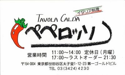 三軒茶屋にはとてもおいしいイタリアン・レストランがあります。しかし、高い。やすくて近くておいしいイタリアンなら「ペペロッソ」。ランチはサラダ+パスタ+コーヒで1100円。パスタの代わりに一品料理でも1200円。有名人もご用達のお店です。