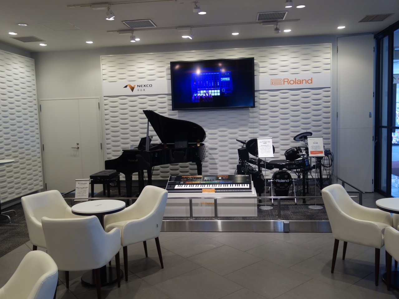 浜松サービスエリアは音楽をテーマとしているサービスエリアです。ミュージックスポットがあって,いろいろな楽器が置いてあり,ときには,生演奏もやっています。それ以外の時には,ここにおいてあるピアノを弾くことが出来ます。ただし,グランドピアノではなく,アップライトのピアノです。音がちょっと特徴的かな。