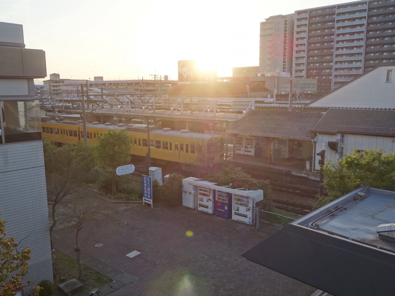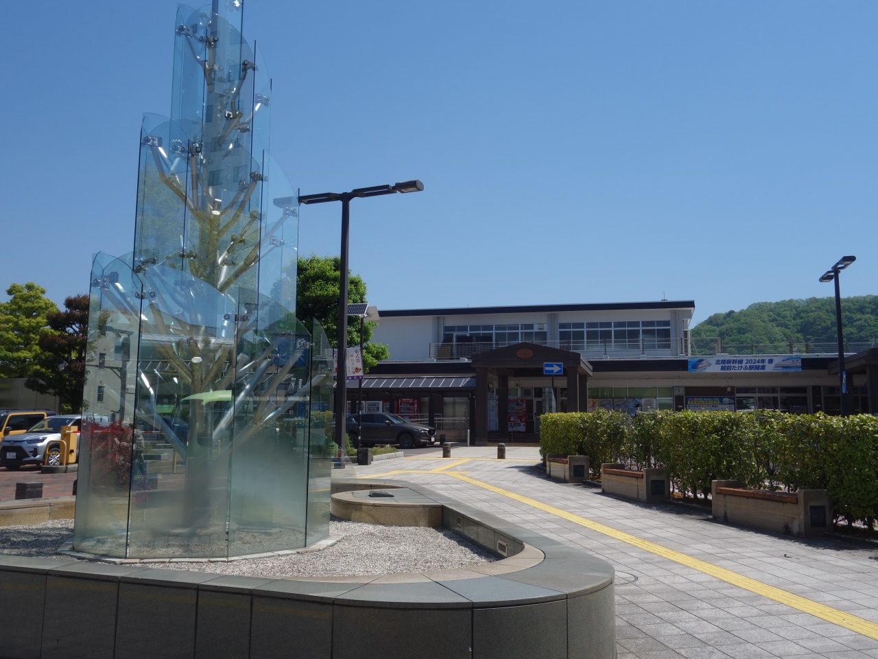 大都市の駅というとどこも大きな駅ビルばかりが目立ちますが,ここは昔ながらの平面形状。高さはぜんぜんありません。そこがレトロチックでとてもいいのです。人間サイズです。駅前広場には芸術オブジェも飾ってあって,親しみがもてます。