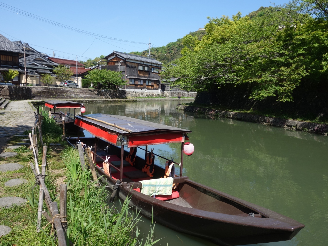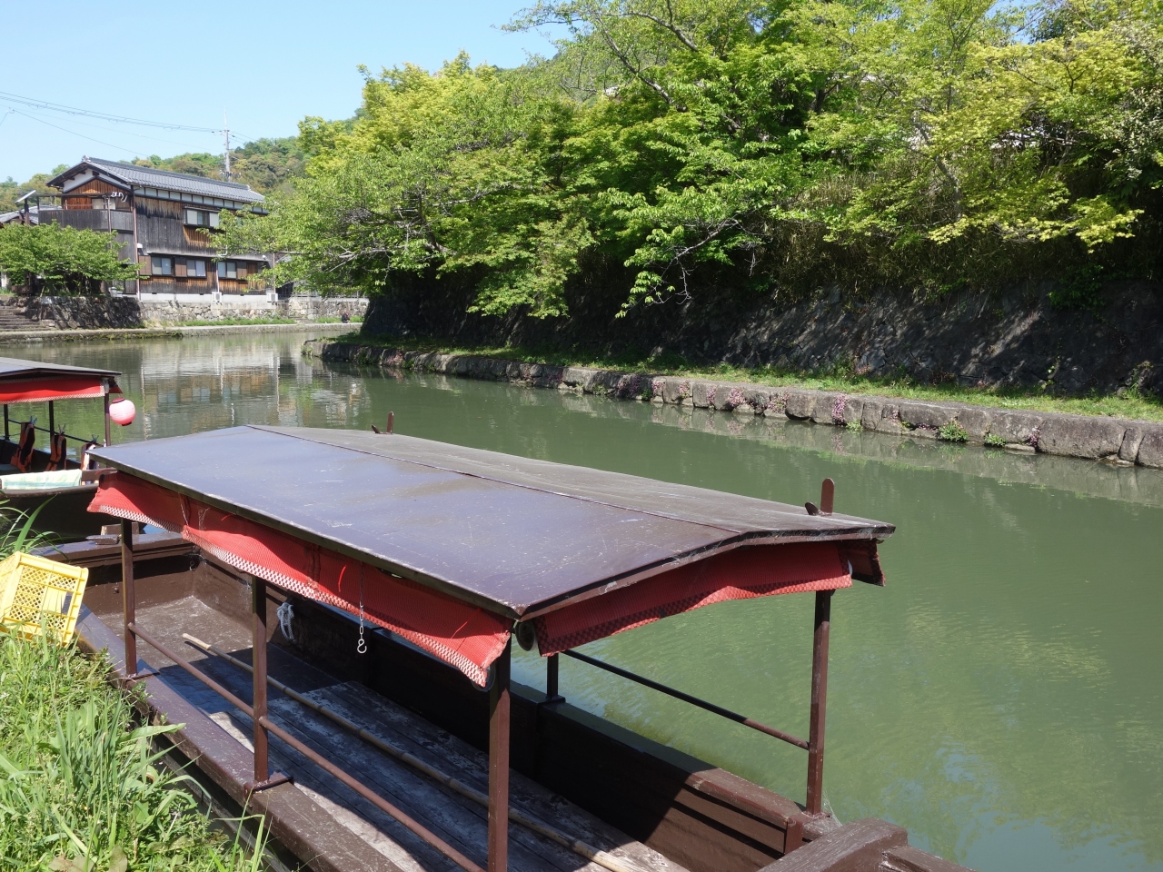 八幡堀の舟遊覧には,(1)手こぎ舟と,(2)エンジン舟の2種類あります。(1)手こぎ舟の乗り場は西。堀の南側。(2)エンジン舟の乗り場は東。堀の北側(八幡様のちかく)にあります。ともに人気が高く,予約しないと乗れないほどです。とてもよい雰囲気なので,ぜひ予約して乗ってみてください。