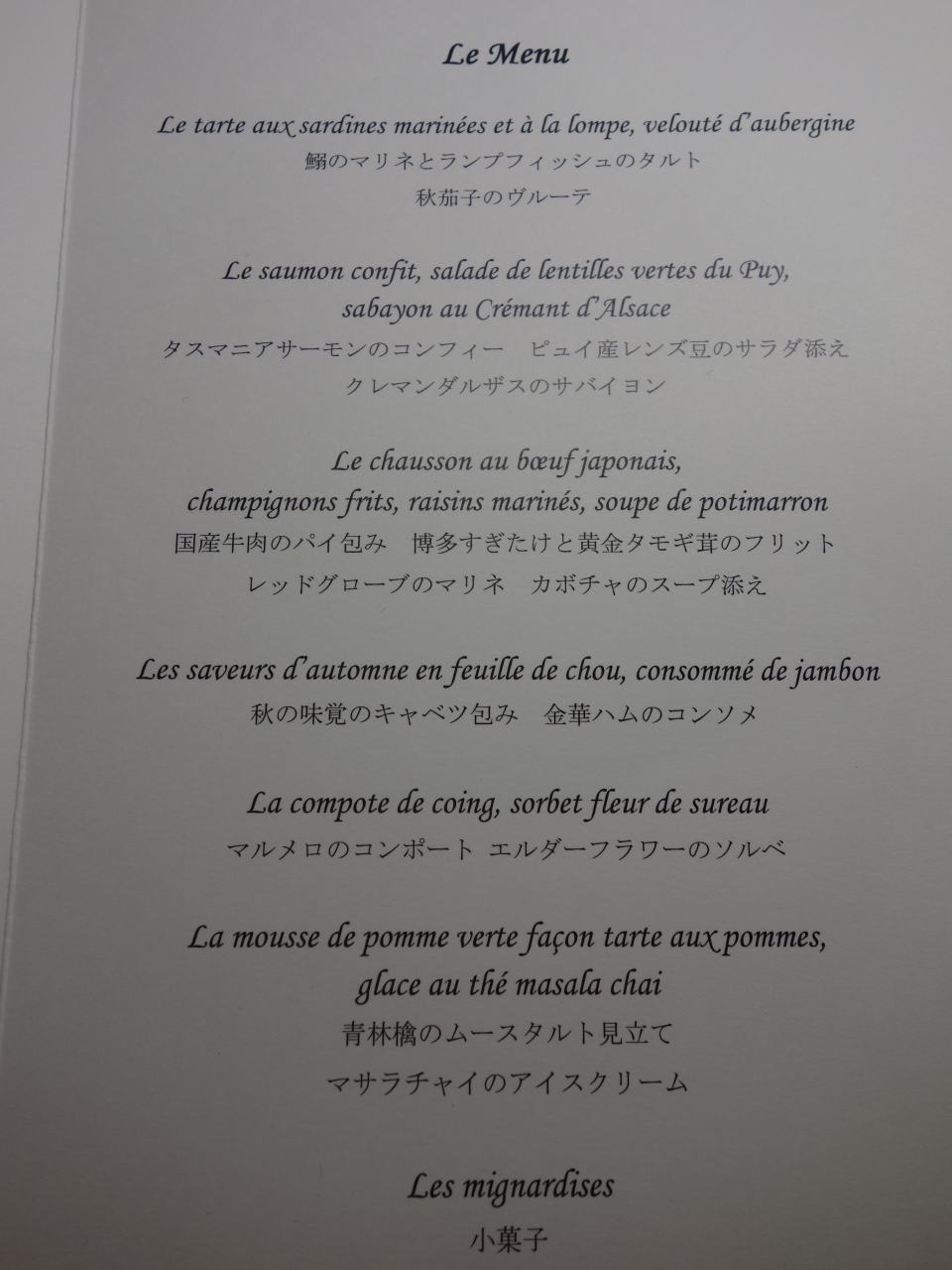 料理は申し分ありません。お墨付きです。本格フレンチですので、手が込んでいます。どれも芸術作品のよう。素材の生のあじではなく、すっかり手を入れてシェフの好みに仕立て上げた料理です。(ゴテゴテしすぎ、という人は、「フレンチ」を理解していない人です。)ランチで12時から3時まで、ゆっくり、しずかに会食できました。(2次会が不要になった、ということ。)
