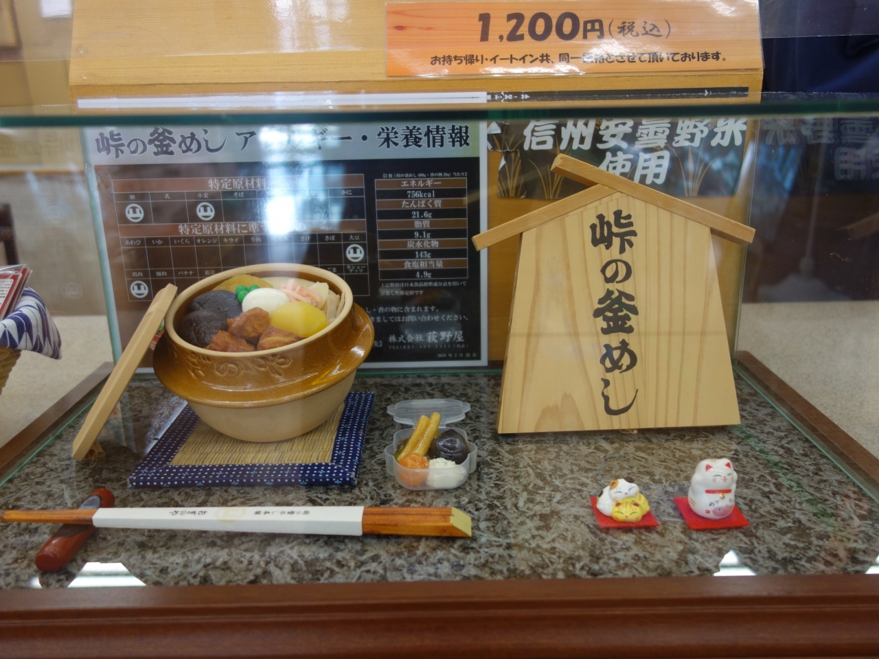 「峠の釜飯」といったら,むかしは,国鉄信越線の横川駅でしたが,現代では,ここに変りました。釜飯といったら,やっぱ,ここで買うしかないでしょう。ここはおおきな道の駅風のところで,店内も広く,イートインも土産物店もとてもひろい。釜飯には何種類かあるようですが,時間のよって,売り切れがあるようです。でも,オーソドックスナ釜飯に売り切れはありません。諏訪湖周辺にきたらゼッタイ寄るべきところです。