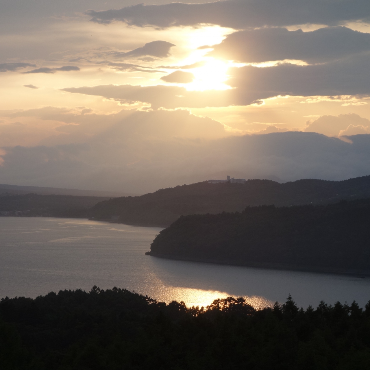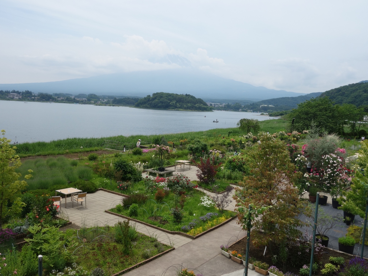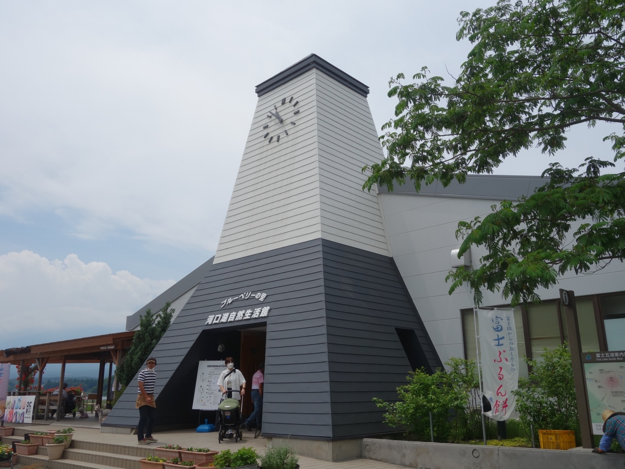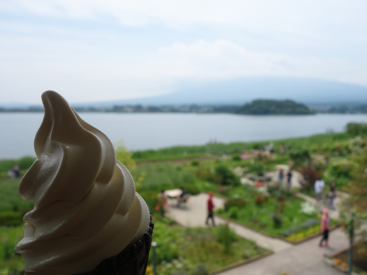 自然生活館の2階に休憩所みたいなところがあります。大きな窓が開放されていて,河口湖と富士山をまん前に一望できます。1階でソフトクリームを買い,2階にあがって,窓際で富士山を眺めながらひとときをすごす。至福のときです。河口湖はいいところです。
