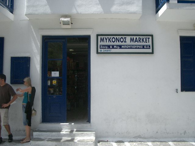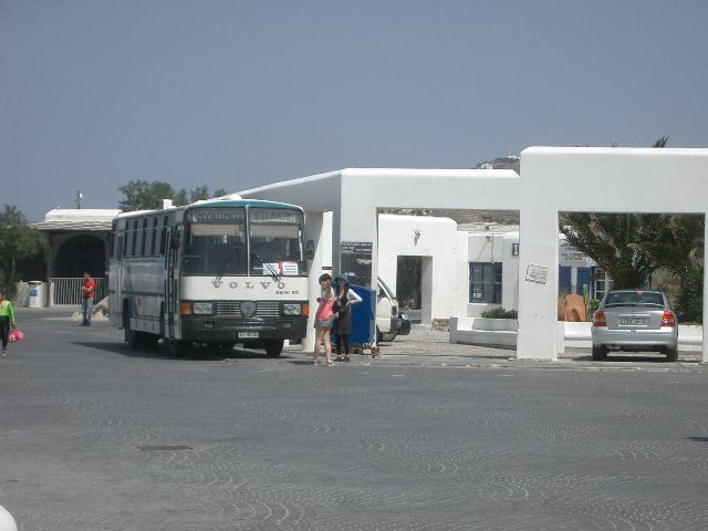 新港はミコノス・タウンから3Km離れています。バスの便はすくなく、黒板に時刻表が書いてあるだけなので、良く確認しておきましょう。写真はタウンのバス停。料金は片道1.10ユーロ。