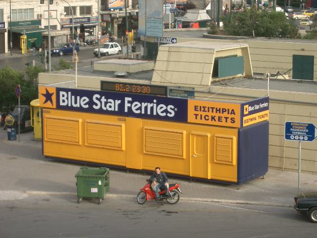Blue Star Ferries の切符売り場はピレウス駅構内にあります。そこを通り過ぎて、横断歩道橋をわたって、港内に入ってしまっても、写真のような小屋で切符を売っていますので、安心して買えます。