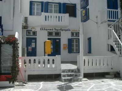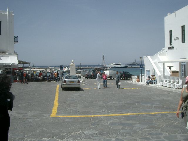 ミコノス・タウンの中央に写真のようなタクシー・スタンドがあります。並んでいるとタクシーがきますが、急いでいつときは、ホテルから電話で呼んでもらったほうが良いでしょう。