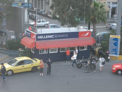 Hellenic Seaways の切符売り場は、駅舎を出て、横断歩道橋を渡り、左側に下りたすぐ先にあります。写真のような小屋ですのですぐに分かります。