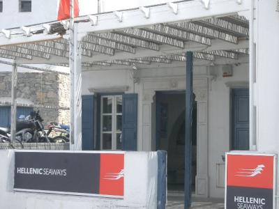 Hellenic Seaways の切符売り場は二箇所あります。ひとつは「北のバスステーション」に(写真)。もうひとつは、タクシースタンドのとなりにあります。帰りの切符を買うのに使えます。新港にな、多分、切符売り場はなかった、とおもう。