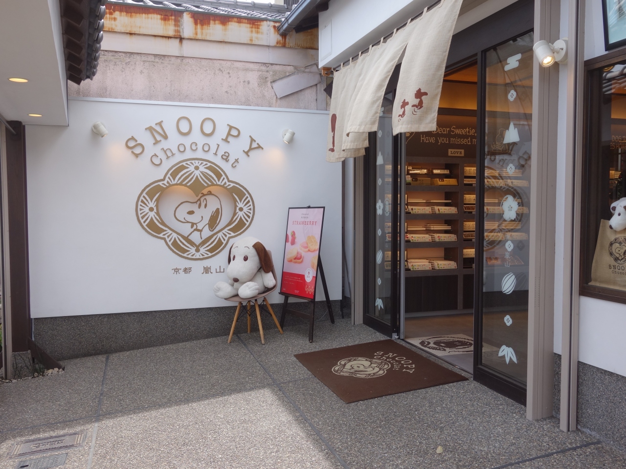 スヌーピーが嵐山にもやってきました。観光地の大好きなイヌですね。渡月橋からまっすぐ行った道を左に曲がると竹林の道にいけますが,まさしくその角にこのお店が開店しました。まだ知らない人が多いのではないでしょうか。チョコレートを専門とするお店で,たくさんある商品をえらぶのに迷います。