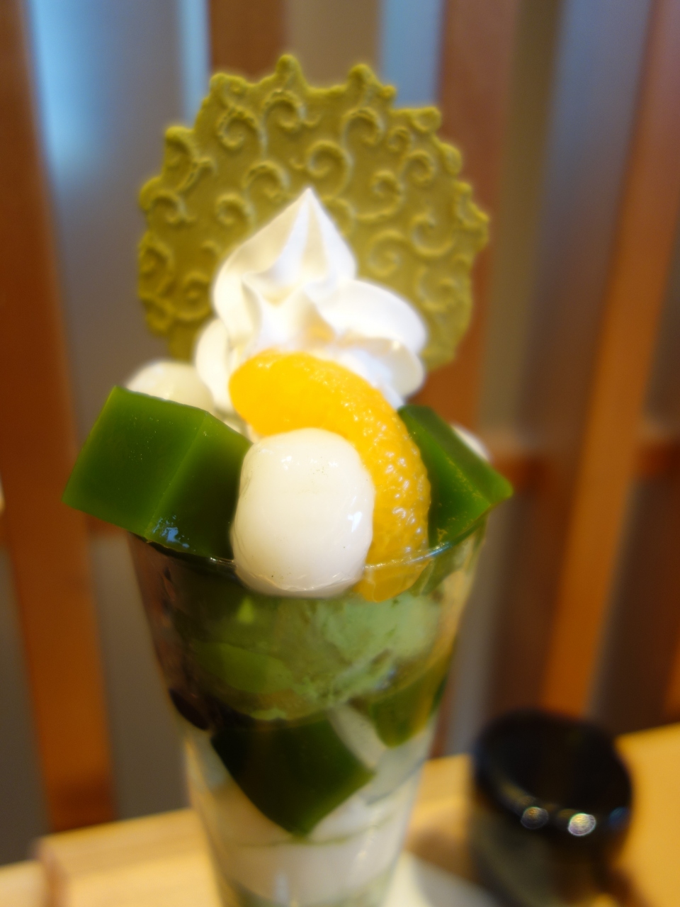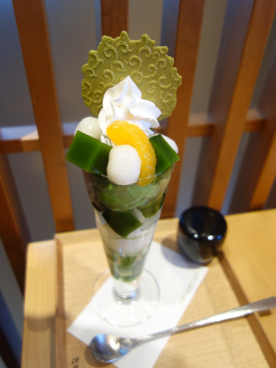 だいぶ前に四条通にこのお店ができました。並びに有名店があり,雰囲気が似ている(店の右側に階段があって,2階に上がるとイートインがある)のでまちがいやすいかもしれません。宇治のお茶のお店ですので,抹茶系のスイーツがおいしいかもしれませんが,ほかにもいろいろとあります。便利なところにあるので,利用しやすいお店です。