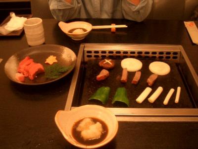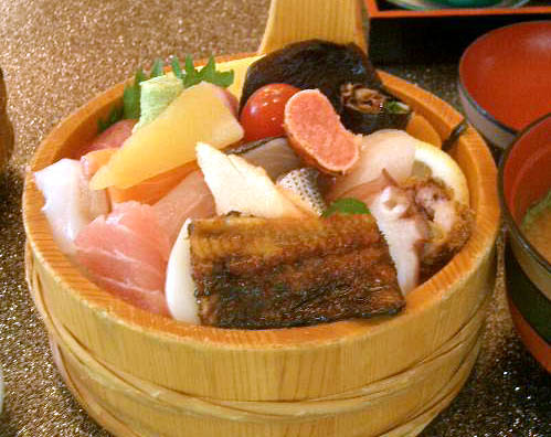 伏見のヒルトンホテル東側の盛田ビル1F。まず、入り口の扉の立派なのに驚く。中に入るとすぐに今日取れたての魚がおいてある。(生簀ではない。)結局それをあとから注文することになる。収容人数は多くは無い。オープンキッチン方式だが、目の前でつくるのは刺身ぐらい。焼き物は裏で焼いている。