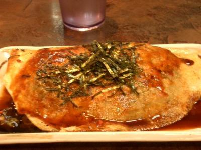 味は辛め。半熟の玉子が中から出てくるのがうれしい。お好み焼きと違って、やわらかめ。ねぎ、ちくわ、のりが特徴的。