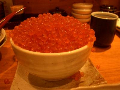 いくら丼の大盛りで~~す。元祖と言ってもいいでしょう。イクラをいくらでもいただくことが出来ます。たっぷりのせてもらいましょう。ただし、食べ残してはいけません。しっかり全部食べなければいけません。自信があったら、たくさんいただきましょう。