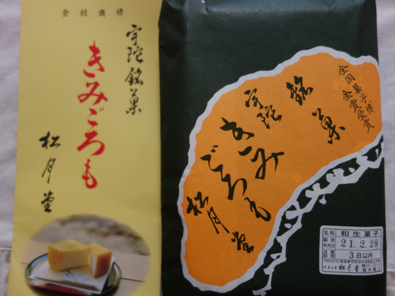 宇陀市松山の街並(重要伝統的建造物群保存地区)の一角にある和菓子屋さん。宇陀を代表する和菓子が,「きみごろも」です。ふんわりと,空を漂う気分を味わえます。西洋のお菓子にはない不思議な気分になります。一度食べたら,このユニークさは忘れないでしょう。