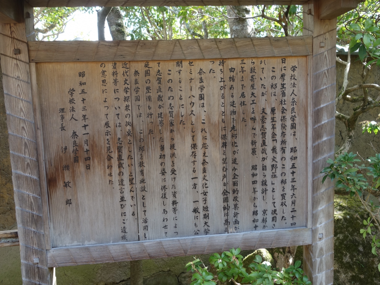 志賀直哉が自分で設計した住宅のようです。志賀直哉は尾道にも旧居があり,公開されているので,いろいろと日本中をすんでいたことになります。「鵠沼まで」の記憶があるので,東京近辺に住んでいたのかと勝手に想像していました。この奈良の家は,現在,学校法人が買い取ってセミナーハウスとして使っているようです。一般公開されています。