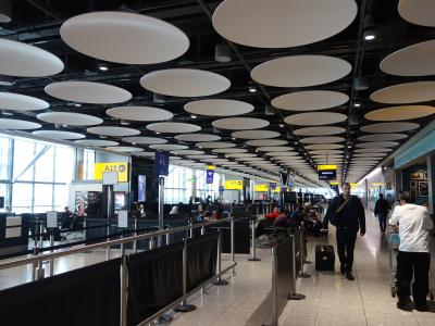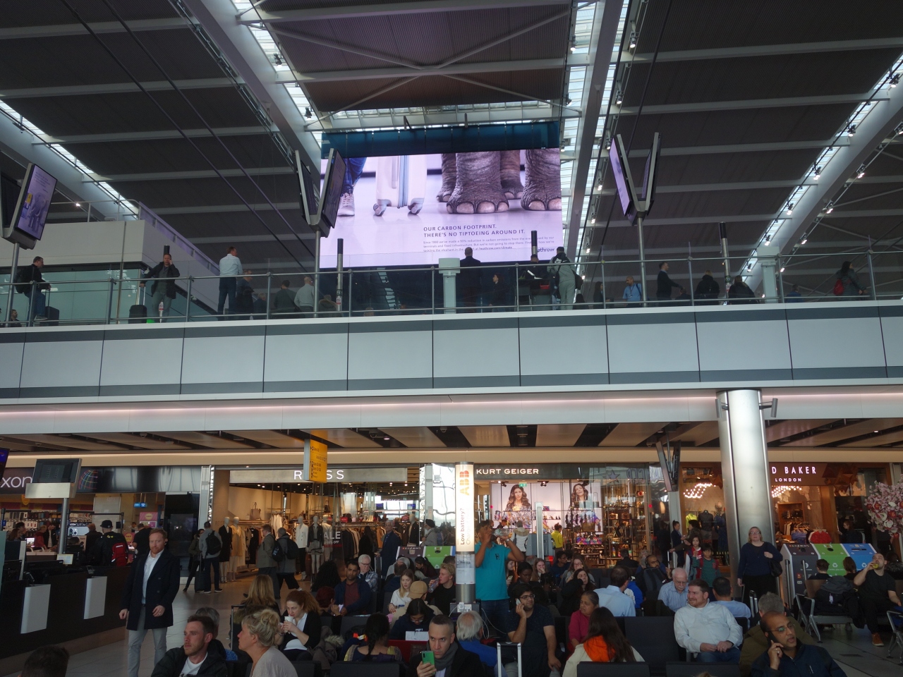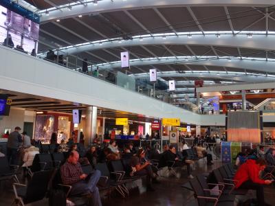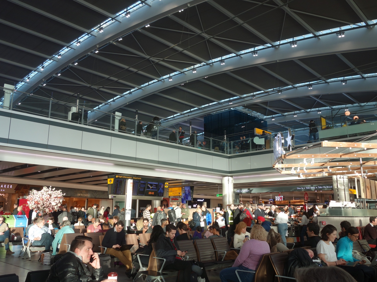 荷物検査を通り過ぎるとお店がいっぱいあって,ロビーみたいなイスのたくさん置いてあるところがあります。人がいっぱい座っています。混雑しています。でも,もっと奥のゲートに近いところではイスがたくさんあるのにすいています。特に買物をするのでなければ,ゲートそばのイスで出発時間を待つのがいいでしょう。