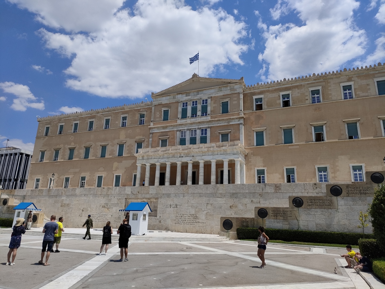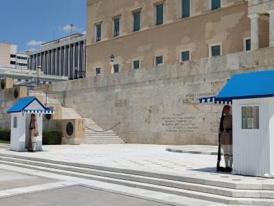 地下鉄Syntagmaの駅を降りて地上に出たら目の前に議事堂があります。入り口には衛兵が警備をしていて厳かな雰囲気を出しています。酷暑の時期からなのか、簡易的な屋根が設けられた日陰を作っていました。じっとしているだけでも汗をかくような暑さの中でお勤めご苦労様です。