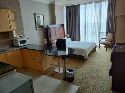 ドーハでの乗り継ぎ時間の関係で一泊だけ利用しました。空港から地下鉄を乗り継いで行くことが可能です。ただ歩くのは非常に暑いですが、歩いている人は少ないので問題ありません。部屋はシングルにも関わらずとても広く、またキッチンやレンジもあるので自炊も可能かと思います。